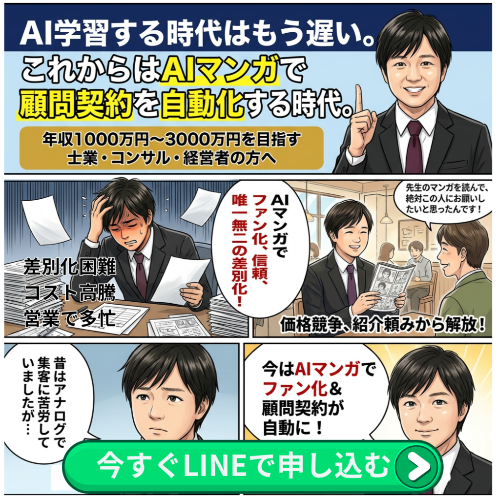 ChatGPTやGeminiなどのAIを活用した仕組み構築の支援、コンサルティングを行っている。この経験から「士業への恩返し」を決意。自身のマーケティングスキルとAI技術を掛け合わせ、士業・コンサルのための集客支援に特化。累計120名以上のサポートを行う。現在はAIマンガを活用したブランディング集客コンサルティングが好評である。