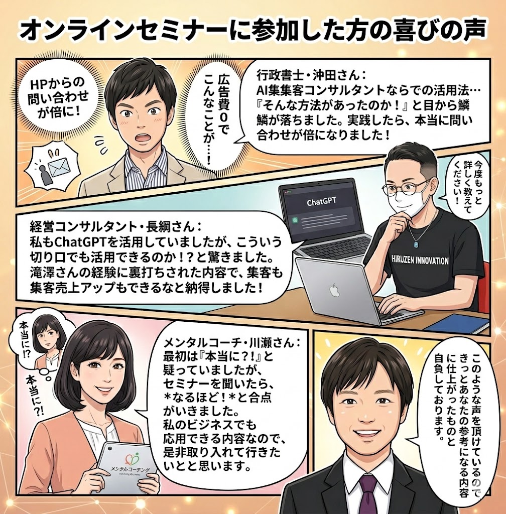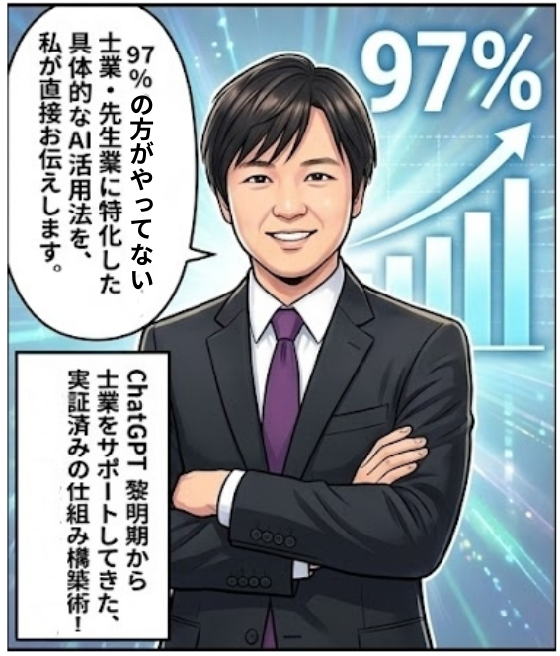 ChatGPTやGeminiなどのAIを活用した仕組み構築の支援、コンサルティングを行っている。この経験から「士業への恩返し」を決意。自身のマーケティングスキルとAI技術を掛け合わせ、士業・コンサルのための集客支援に特化。累計120名以上のサポートを行う。現在はAIマンガを活用したブランディング集客コンサルティングが好評である。