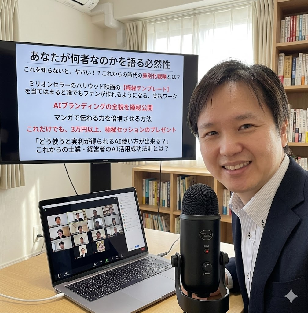 ChatGPTやGeminiなどのAIを活用した仕組み構築の支援、コンサルティングを行っている。この経験から「士業への恩返し」を決意。自身のマーケティングスキルとAI技術を掛け合わせ、士業・コンサルのための集客支援に特化。累計120名以上のサポートを行う。現在はAIマンガを活用したブランディング集客コンサルティングが好評である。